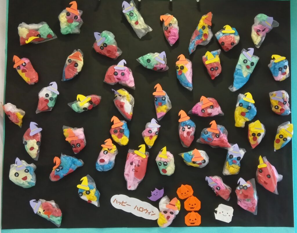 縦長のおばけや横長のおばけ、中身のお花紙もぎゅっと丸めるお子さんやふわっと丸めるお子さん、皆思い思いのおばけを作成していました♪
